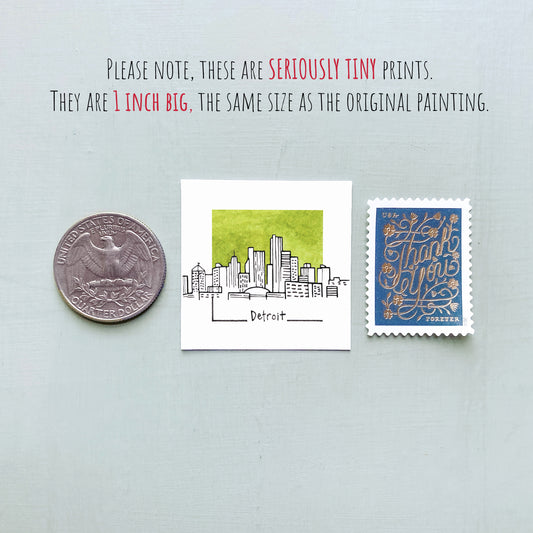 Mini Detroit, Michigan 1.5" Watercolor and Ink Art PRINT