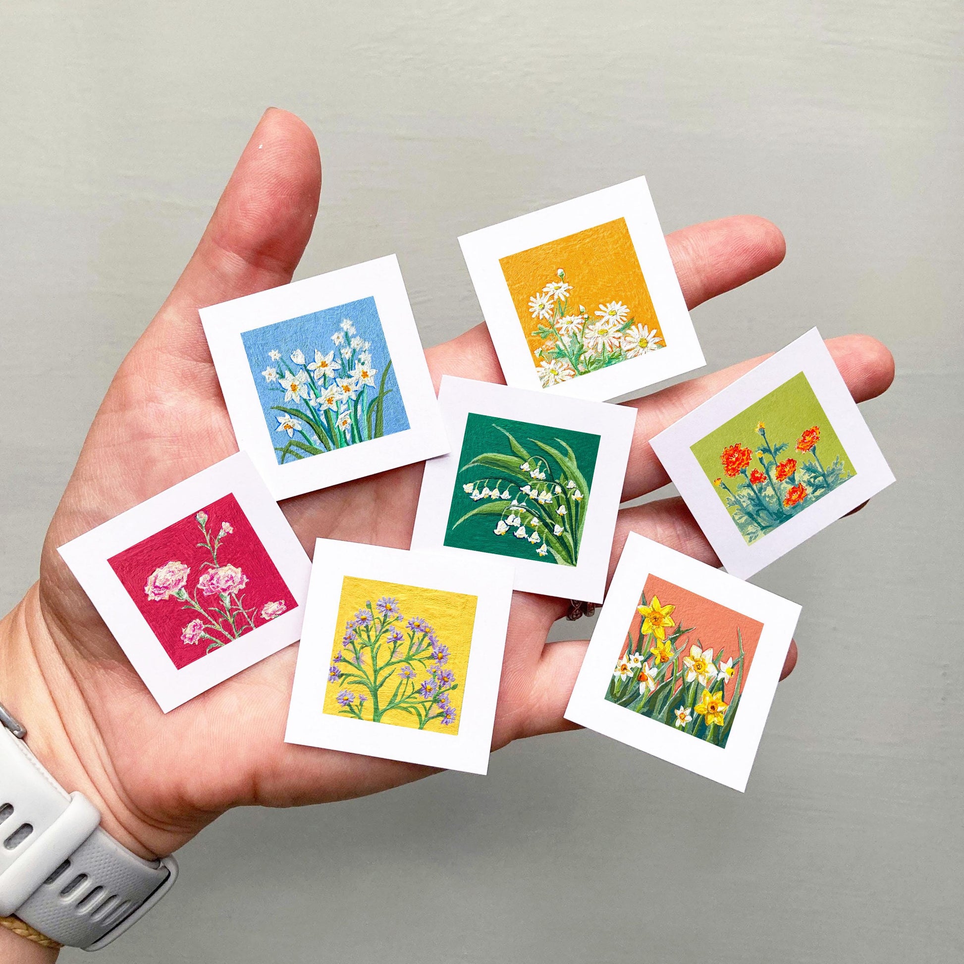 These prints feature tiny birth flower designs for each month of the year that were all painted with gouache over the course of a few weeks. (You can see the process videos behind them on Instagram @micks.art.goods) These prints are the same tiny size as the original paintings.
