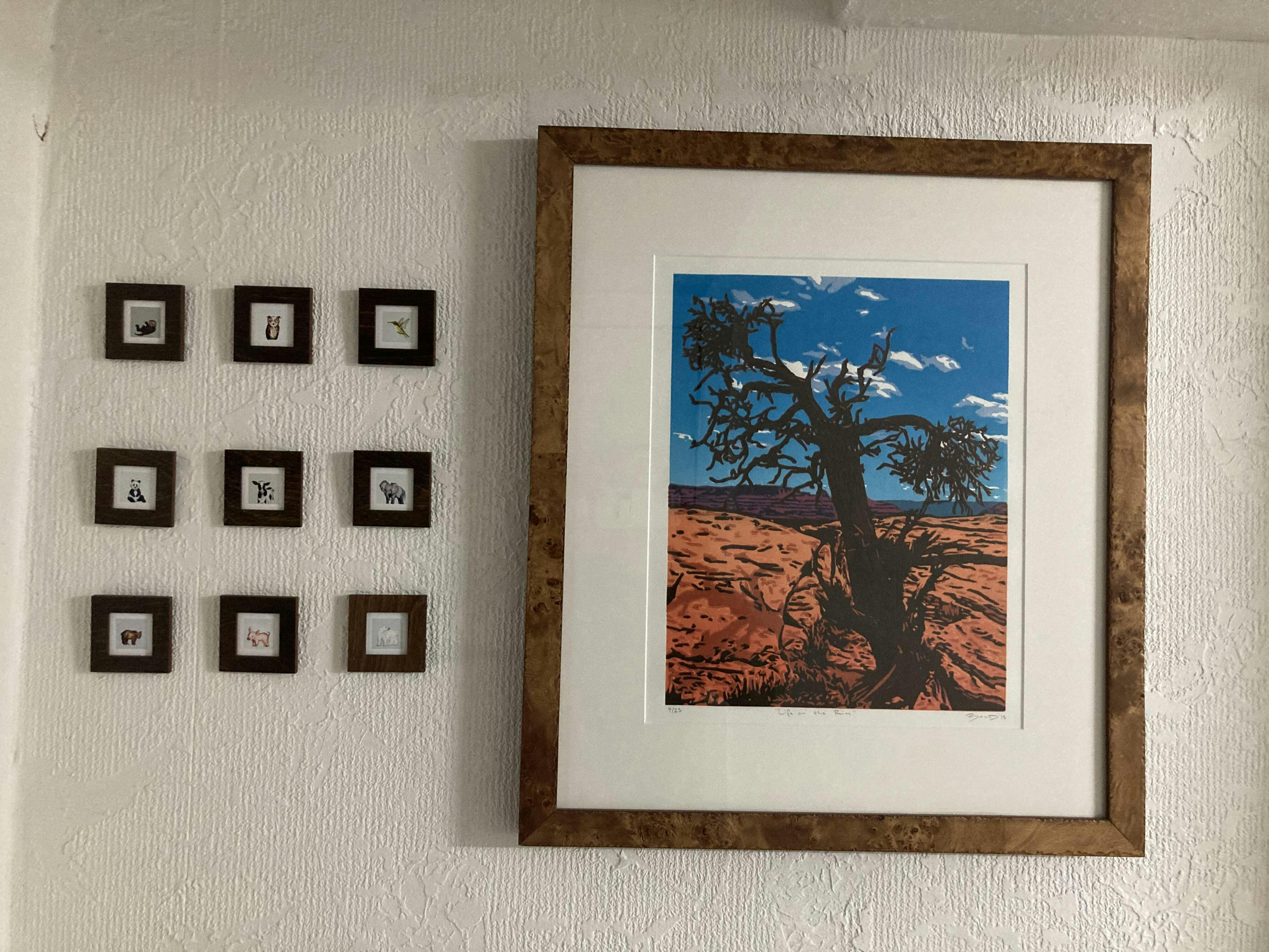 This artwork also has the option of being framed in their own tiny frames. There are five options for frames-- wooden, black, or white wall frames, dangling frames, or magnet frames. All frames have been custom designed to fit this tiny art perfectly.